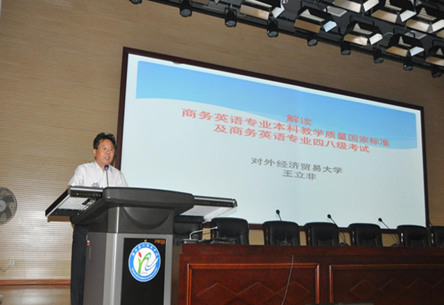 本网讯 5月30日,北京对外经济贸易大学教授王立非在图书馆2号报告厅为外国语学院师生作了题为《解读商务英语专业本科教学质量国家标准及商务英语专业四、八级标准》的讲座。随后,王教授还与学院领导、老师进行深入地座谈,并对商务英语专业的建设提出了指导意见。