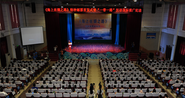 本网讯(学通社记者 兰佳其 张维佳)9月10日上午,《海上丝绸之路》特种邮票首发式暨“一带一路”汉语国际推广活动在我校大礼堂隆重举行。该特种邮票1套6枚,图案内容分别为:政策沟通、设施联通、贸易畅通、资金融通、民心相通、海上交通。这也是第一次将《海上丝绸之路》特种邮票首发地设在高校。