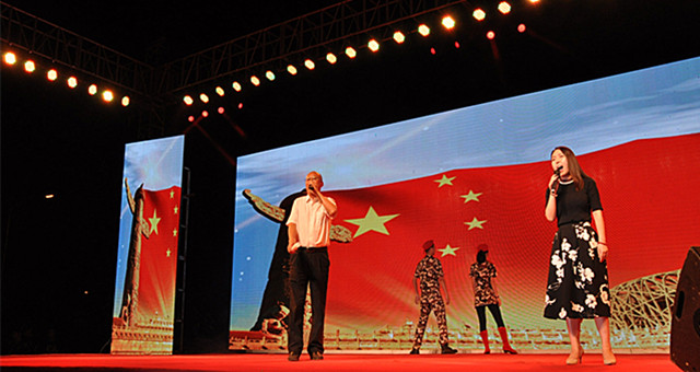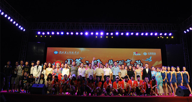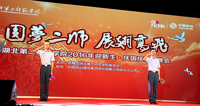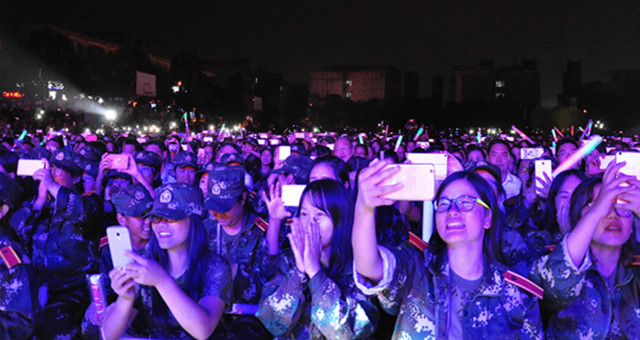 本网讯(学通社见习记者 杨思敏)9月20日晚,我校2016年“迎新生·庆国庆”文艺联欢晚会在寸草园篮球场激情上演。校长胡仲军,副校长黄颂、夏力,军训部队首长、教官,2016级4000多名学生等观看了演出。