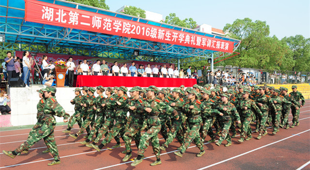 典礼伴随着激昂雄壮的国歌拉开帷幕,党委书记张国秀宣布阅兵开始,黄颂在部队首长陪同下检阅军训方队。“同学们好!”“首长好!”“同学们,辛苦了!”“为人民服务!”……高亢有力的声音响彻在运动场上空。