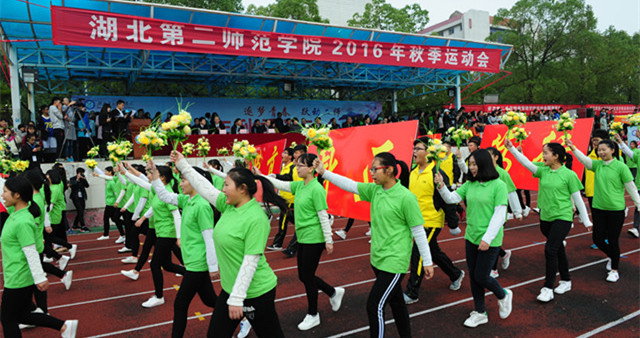在激昂的《运动员进行曲》中,各方阵走入运动场。首先进入观众视野的是国旗队、鲜花队和会旗队,他们步伐稳健,脸上写满了自信与朝气。紧接着,女子鲜花主题方队面带微笑,用鲜花和绸带摆成“二师85”的图案,为建校85周年献礼,令人眼前一亮。“年少识武,可取天下;而后知文,能御九州”,男穿中山装,女穿白衣黑裙,人手一国旗缓缓摇曳,在观众的惊叹声中,文学院代表队迎面走来。“We are the winner! We are the leader!”身穿八路军、新四军的军装,踏着整齐的步伐,外国语学院以此表达“弘扬长征精神,建设美丽祖国”的希冀,纪念长征胜利80周年。13个学院的方阵依次通过主席团,各具特色的展示,引起现场观众的阵阵欢呼。