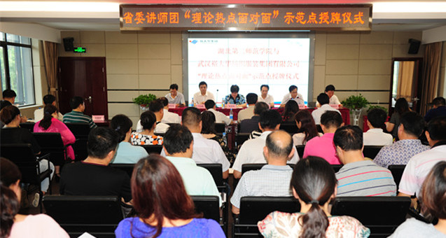 本网讯(记者 李道君 学通社记者 朱娜)6月8日下午,省委讲师团“理论热点面对面”示范点授牌仪式在武汉裕大华纺织服装集团有限公司(以下简称“裕大华集团”)三楼会议室举行。由此,我校正式成为省委讲师团“理论热点面对面”20个示范点之一,也是省内唯一一所与国有企业共建示范点的高校。