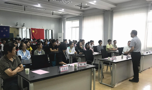 国际交流合作处处长乐三明采用中英文互译的方式介绍了计算机科学与技术中外双学位项目的独特优势和项目管理要求。他介绍,目前两校已经合作了六年之久,我校每年都会外派老师去新西兰研修,交流频繁,合作密切。同时,他强调了四个“不一样”,即录取条件不一样、双方教学计划不一样、外语教学和学生的能力培养不一样、毕业之后拿的中外双学位的含金量不一样。