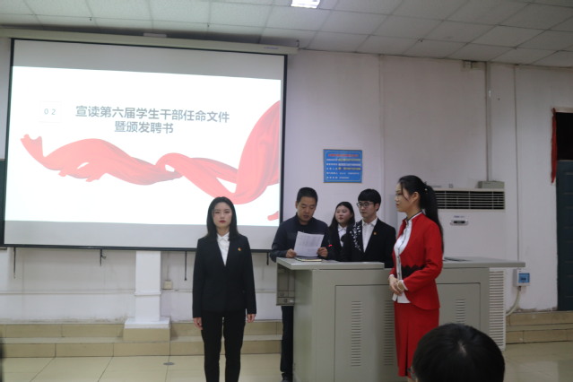 在激昂的中国共产主义青年团团歌中,大会拉开帷幕。高阳宣读第六届学生会干部任命名单,李智慧、刘文君和章缙为其颁发聘书。
