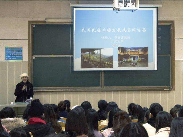 本网讯(见习记者 彭依婷 倪珍)11月22日,第135期光谷论坛讲座——“我国民宿业的发展研究”在我校阶梯教室4举办。江汉大学商学院旅游与酒店管理系教授、武汉市高校学科带头人张金霞教授受邀主讲,我校财务处处长王诗龙、旅游与酒店管理系专业负责人夏华丽参加,旅游与酒店管理系主任马达主持。