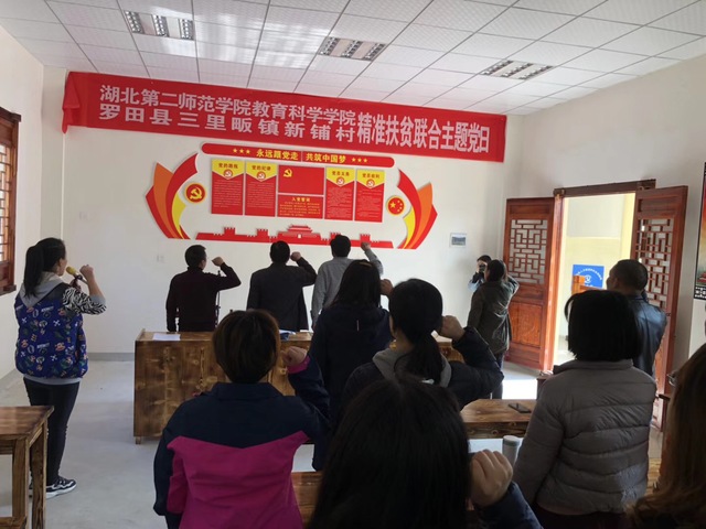 全体党员奏唱国歌,重温入党誓词,大会正式开始。乐三明指出,实脱贫攻坚行动是我们党和政府践行以人民为中心的执行理念,实现两个百年的奋斗目标和实现“中国梦”的重大决策。他表明此次联合主题党日活动的意义:一是学习借鉴三里畈村的精准扶贫实践经验,二是学习优秀党员的先锋模范带头精神,三征求村委干部对我院进一步对口深化教育精准扶贫的建议。
