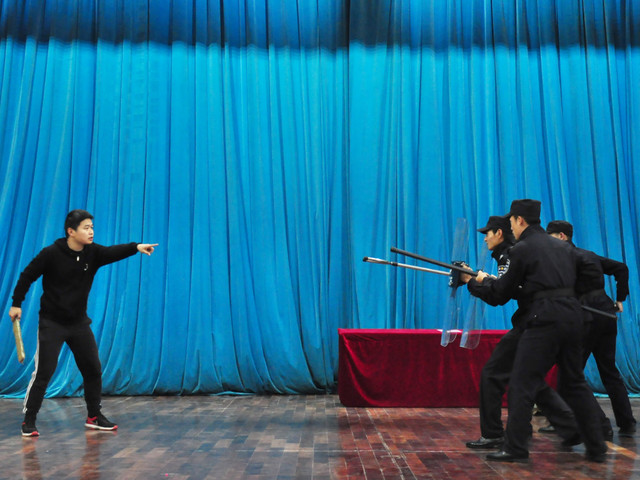 来自地铁11号线的安保人员们则现场模拟和持刀进站的“歹徒”搏斗过程:4位安保人员手拿钢叉、电警棍、安保盾牌等工具合力抵抗“歹徒”,最终制服“歹徒”。最后,进行地铁11号线“迎军运,保平安”安全校园行系列违禁品进行展示,不少学生在活动横幅上签名并作出承诺。