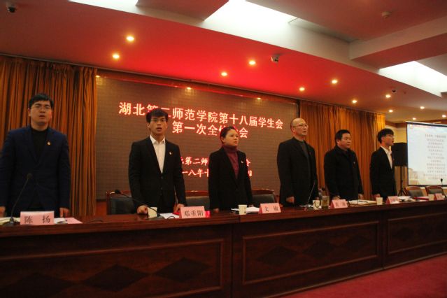 会议伊始,全体成员起立奏唱《中华人民共和国国歌》,文敏宣读《关于2018年各学院学生会主席团成员职务任命的通知》,金殿中宣读《关于湖北第二师范学院第十八届学生会秘书长、主席团的任命通知》。