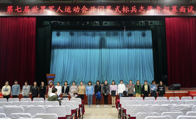 本网讯(记者 陆佳珺)3月14日中午,我校第七届世界军人运动会开闭幕式标兵志愿者招募面试在大礼堂举行。我校校团委书记文敏、校团委副书记陈扬、校团委组织部部长、校志协指导老师樊勇到场指导。