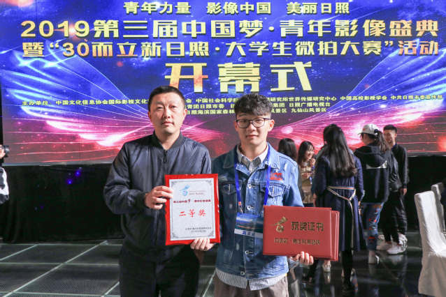 本网讯(记者 张维熙 通讯员 徐梦媛)4月20日上午,纪念五四运动100周年第三届“中国梦·青年影像盛典”开幕式在山东省日照市广播电视大厦1000平米演播大厅举行,文学院1080影视创意团队骨干成员吴正欢等5人的3部优秀微视频作品获奖。文学院王蔚岚老师带代表吴正欢参加盛典并领奖。