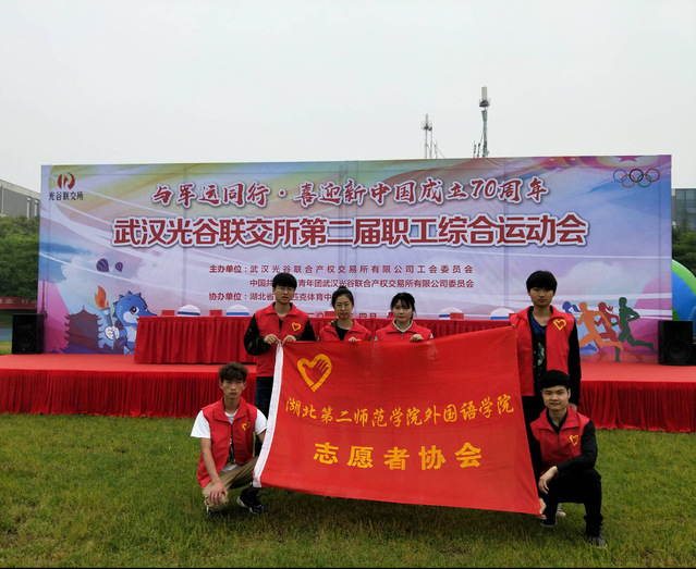 本网讯(通讯员 施若倩)2019年4月24日上午8时,我校外国语学院分团委青协部10名志愿者到达湖北省奥林匹克体育中心,为武汉光谷联交所举行的第二届职工综合运动会担任裁判一角。