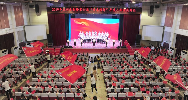 典礼在合唱《光荣啊,中国共青团》团歌中拉开序幕。会上,宣读了《关于表彰 2018 年度校“五四红旗团委”、“优秀共青团员”等先进集体和优秀个人的决定》文件;观看了第六届“青春榜样”年度人物视频;参会领导分别为优秀共青团员代表、优秀共青团干部代表、优秀团支部代表、五四红旗团委、“青春榜样”年度人物等先进集体和个人颁奖。