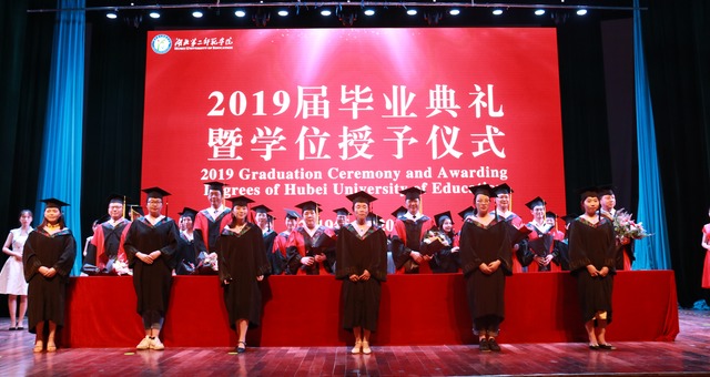 毕业典礼在奏唱国歌中拉开帷幕。主持人宣读《湖北第二师范学院关于授予2019届普通本科毕业生学士学位的决定》,并介绍各学院毕业生、学位获得者及考研录取情况。校领导和各学院院长为毕业生代表拨穗、颁发学位证书。毕业生代表为校领导和老师献花,并合影留念。大屏幕上播放《一九•依旧 毕业季》视频,勾起了在场毕业生对大学四年的美好回忆。