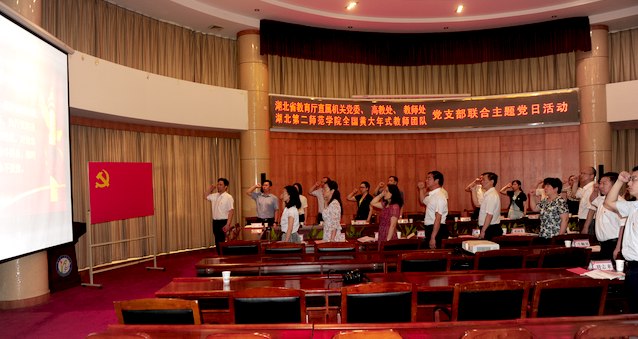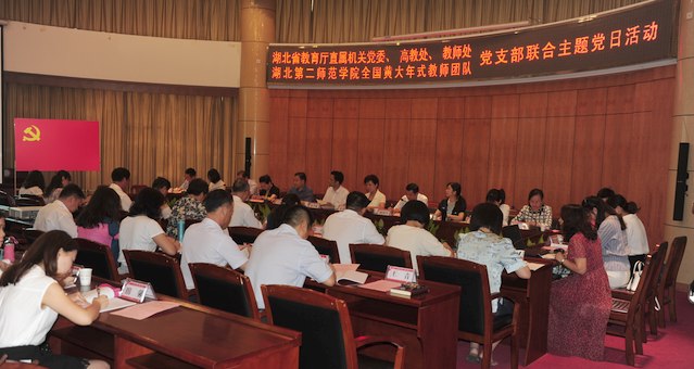 本网讯(记者 程丽鹃)7月2日上午,湖北省教育厅直属机关党委、高教处、教师处党支部联合我校马克思主义学院全国黄大年式教学团队的教师党支部在行政楼一号会议室开展了“不忘初心 牢记使命 庆祝中国共产党建党98周年”主题党日活动。湖北省教育厅副厅长、党组成员、省委教育工委委员余学敏以普通党员的身份参加活动,教育厅直属机关党委副书记王力勤主持活动。我校党委书记张国秀,党委副书记柯美录,副校长黄颂一同参加。