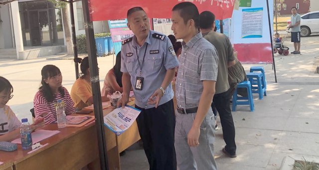 迎新现场,综合治理与安全保卫部为新生发放《新生安全须知》,强化新生安全防范意识,为新生上好“安全教育课”。(图片来源于影像工作室)