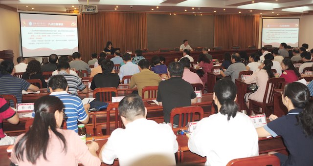 本网讯 9月29日上午,学校“不忘初心、牢记使命”主题教育集中学习在行政楼五号会议室举行,我校马克思主义学院副教授刘雯博士作了题为《坚定“四个自信”跟党走——从中美贸易摩擦实质及其影响谈起》的辅导报告。全体校领导出席,中层副职以上干部、党支部书记参加,校党委副书记柯美录主持学习会。