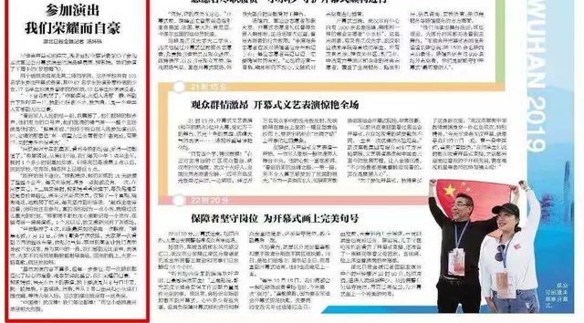 10月19日,《湖北日报》军运专版第5版刊载了对我校参加军运会开幕式演员柳紫嫣、解晨雨的专访——《参加演出我们荣耀而自豪》,全文如下: