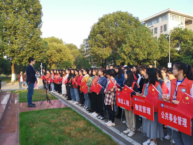 本网讯(通讯员 赵梦君)2019年10月21日上午7时,在校南大门国旗台处,管理学院在全校各教学学院中率先开展“不忘初心,牢记使命,我与祖国共奋进—国旗下的演讲”主题教育活动。管理学院领导、辅导员老师、学生党员代表、入党积极分子和2019级各班全体班委参加。