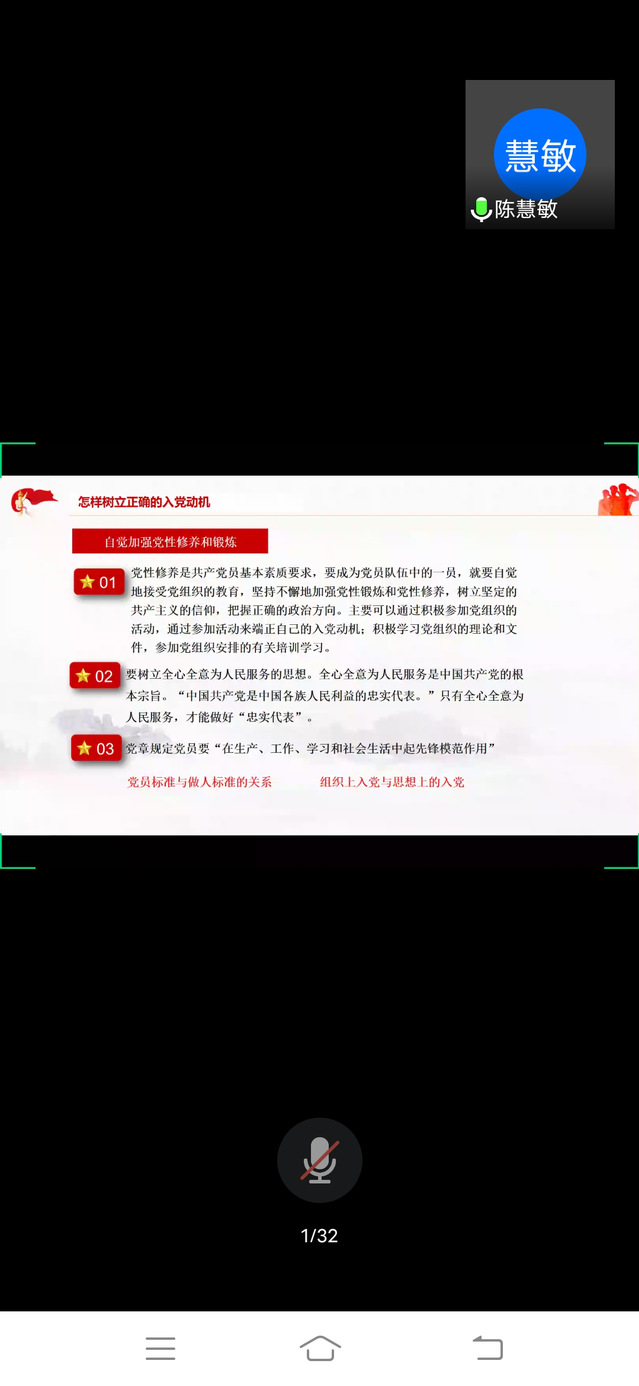 对于端正入党动机的重要性,她指出,正确的入党动机是正确行动的精神力量,只有树立了正确的入党动机,才能有持久不衰的动力,才能够在日常工作和生活的方方面面更加严格地要求自己。陈慧敏表示,希望计算机学院学生第一支部全体成员加强自身的思想觉悟及政治觉悟,在行动上努力向党组织靠拢,在思想上以合格的共产党员的标准时刻要求自己。(编辑 彭依婷)