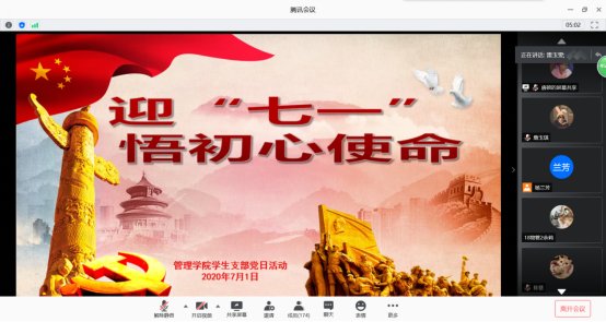 本网讯(通讯员 张柏芝)7月1日中午,管理学院学生党支部借助腾讯会议召开了“迎七一,悟初心使命”线上主题党日活动。学生第一、第二党支部书记周慧东、席中刚,辅导员、支部组织委员杨兰芳、辛雯,学生党支部全体学生党员、入党积极分子参加本次会议,雷玉雯同志主持会议。