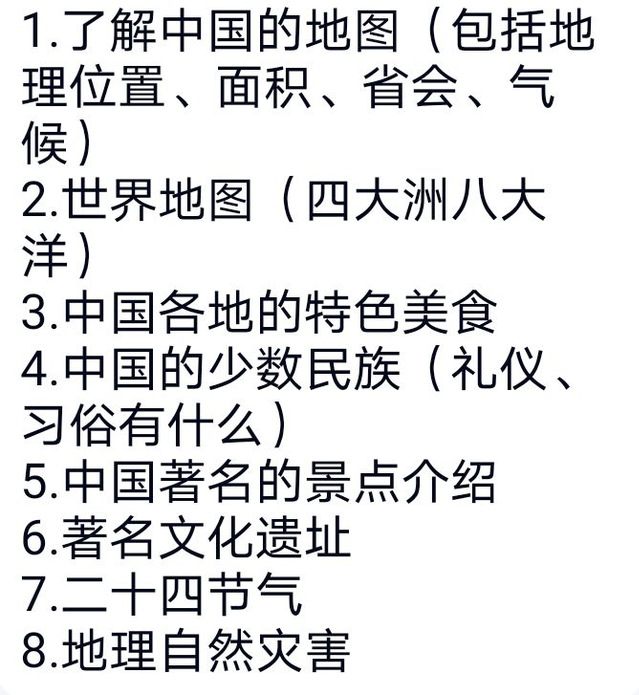 人文地理一般能够反映一个地方的风土人情、风俗习惯、文化特质等等,是学生们容易接受和理解的地理知识。志愿者李继欣在制作课程时首先列出大纲,基本上围绕中国这一个国家进行展开,目的是使学生更深入地认识我国,领略中国各地的不同风貌特点。其中,教师讲述了中国的少数民族,介绍了不同民族的礼仪和习俗,学生纷纷表示他们的家乡也有很多少数民族,还能列举出十来个;当介绍中国八大菜系及其他含地域特色的美食时,随着志愿者放映出的各种美食图片,学生们兴趣大增,表示以后要尝遍这些菜系;而当涉及到旅游地理知识,讲解中国著名的旅游城市及旅游景点、著名的文化遗址时,学生们则尤为惊叹,感悟祖国的大好河山……孩子们在欣赏知识点对应的图片与视频产生了浓厚的兴趣并学习到了相应的地理知识。