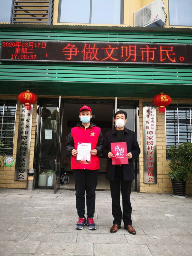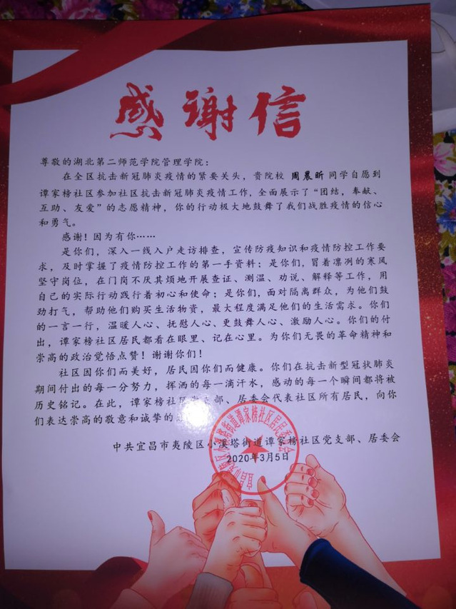 据了解,周晨昕和其他社区工作者一起用实际行动守护着谭家榜社区群众的生命安全,他的出色表现得到了社区党支部、居委会的肯定和表扬,同时也收到了宜昌市夷陵区谭家榜社区的感谢信,为全面打赢疫情防控阻击战贡献了自己的力量。
