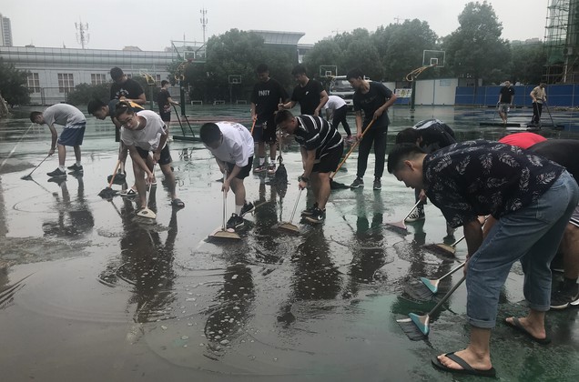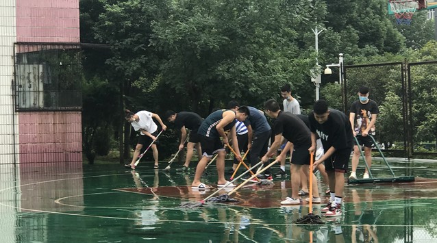 体育学院分党委书记张绍明带领突击队手持扫帚、地刷、拖把等劳动工具球场地面的尘土污渍等进行了洗刷,后勤集团安排专用洒水车进行高压冲洗。经过4个多小时的劳动,球场洁净如新。