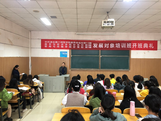 本网讯(通讯员 王聪)10月29日,中共湖北第二师范学院委员会党校第15期暨数经院分党校第3期、新传院分党校第1期发展对象培训班开班典礼在阶梯教室3举行,数经院党委书记钟建国、副书记汪平参加,数经院学生第一党支部书记朱玉主持。