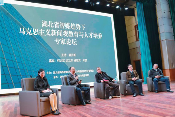 启动仪式后,省内学界、业界导师代表开展了题为《湖北省智媒趋势下马克思主义新闻观教育与人才培养》的专家论坛。论坛由湖北省高等教育学会新闻与传播教育专业委员会主办,我校新传学院承办。武汉大学新传学院院长强月新教授主持论坛,华中科技大学新闻与信息传播学院何志武教授、大楚网副总裁吴卫东、湖北大学新闻传播学院副院长杨翠芳教授和湖北长江云新媒体集团总经理朱昊进行了分享与交流讨论。(编辑 张震)