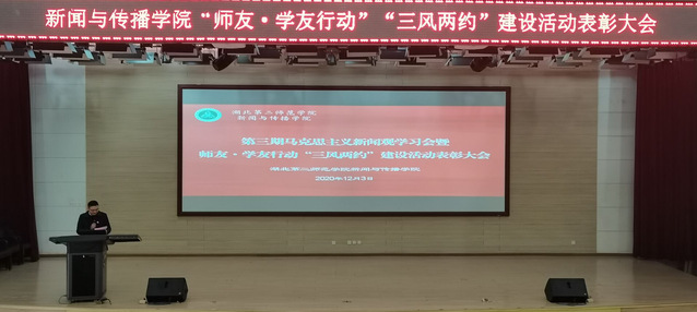 本网讯 (融媒体见习记者 郭晓 甘晓雨)12月3日下午,新闻与传播学院(以下简称新传院)在新图书馆二号报告厅举行第三期马克思主义新闻观学习会暨师友·学友行动“三风两约”建设活动表彰大会。校宣传部常务副部长方喻、新传院党总支书记徐晓及宣传部全体师友老师参加会议,新传院分团委书记、学工办主任孟黎明主持会议。