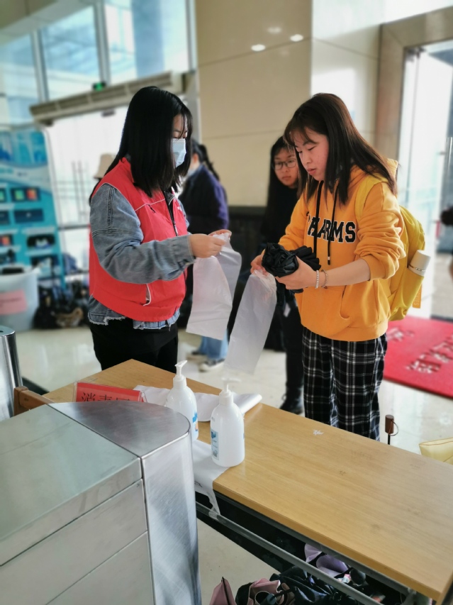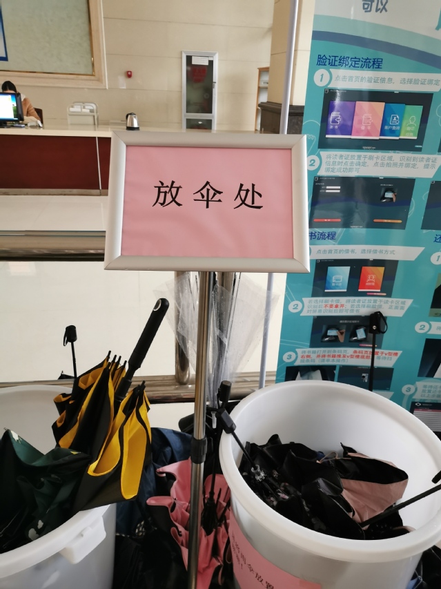 本网讯 3月16日上午,在图书馆入口处,有工作人员带领两名学生志愿者在向入馆的学生发放伞袋,并指引学生有序将伞放置“放伞处”。首次,下雨天图书馆大厅没有了“伞海”。这样不仅美化了环境,还消除了滴水摔跤的隐患。