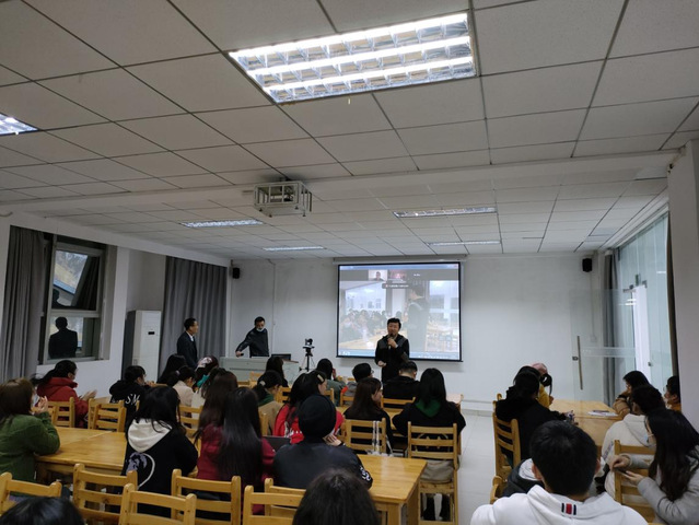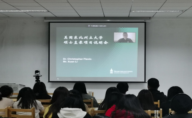 李晅与弗莱文教授分别对美国东北州立大学的办学历史、学科门类、特色专业及英语相关的硕士专业的课程设置、学习要求、毕业前景等方面做了详细的介绍。随后,李晅介绍了留学费用和奖(助)学金设置情况,并表示该校不仅特别为合作院校的留学生开设全额奖学金和半额奖学金,还会提供助理工作。他鼓励同学们夯实国内学业,以优异的成绩申请奖(助)学金出国留学,节省留学费用;也希望大家在赴美留学的同时,在当地社区宣介中国优秀的文化,成为中国文化的交流者、传播者。