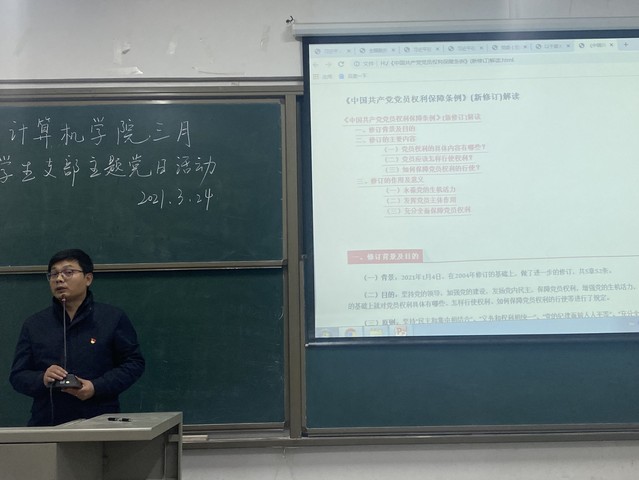 活动伊始,熊军平向大家汇报计算机学院正式党员党费缴纳情况。紧接着,主讲人带领全体与会人员通读党章,全体党员起立,放声朗读。活动进行到第三项,邓家桃带领全体正式、预备党员集中学习总书记讲话、《中国共产党党员权利保障条例》等。