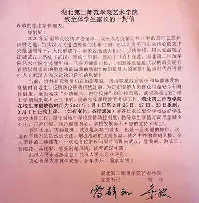 本网讯(通讯员 杨柳依 李奕琪)为促进家校联系并做好疫情防控工作,2020年寒假前夕,在院长金波教授、党委书记雷静和的倡议下,艺术学院撰写了《湖北第二师范学院艺术学院致全体学生家长的一封信》。信中不仅讴歌伟大战疫精神,还提出个人防疫、学习生活和安全教育等建议,广受家长们好评。