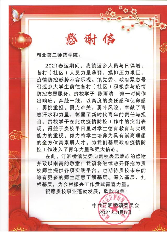 本网讯(通讯员 席中刚)近日,我校收到了一封来自中共咸宁市汀泗桥镇委员会的感谢信。汀泗桥镇委对湖北第二师范学院(以下简称我校)管理学院2018级公共事业管理专业学生陈雨晴在疫情防控工作中的付出表示由衷的感谢,并对我校致以崇高的敬意!