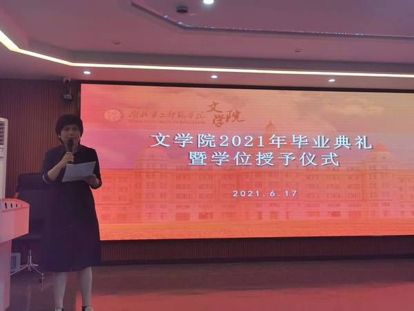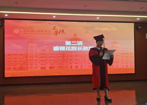 文学院院长盛银花在致辞中说,2021届毕业生见证了文学院的发展,毕业生们要继续做到讲好一口话、写好一笔字、装满一肚子学问,还要保持一脸阳光。