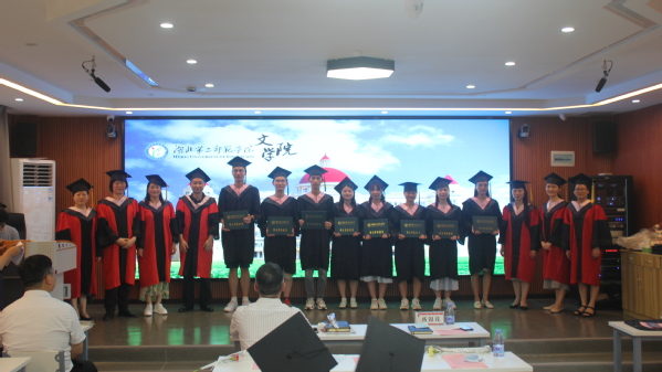 谢民宣读学位授予决定后,盛银花、陶新武、董玲、戴峰、龙珍华、黄均凤、马英等七位学位导师为毕业生拨流苏,颁发学士学位证书并合影留念。