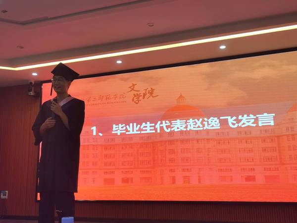 典礼上,毕业生代表赵逸飞分享了自己四年的大学生活的成长与感悟,祝愿大家用奋斗做青春最亮丽的底色,祝愿母校越来越好。