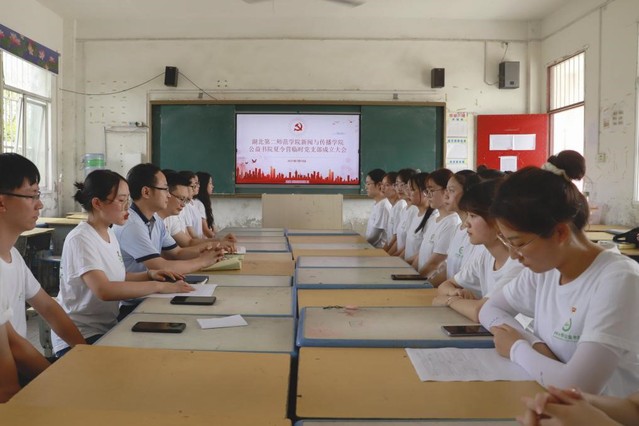 本网讯(通讯员王流轩 段紫维)为加强党的领导,充分发挥党支部战斗堡垒和党员先锋模范作用,2021年7月10日下午,新闻与传播学院在汉川市刘洲中心小学五年级教室召开公益书院夏令营临时党支部成立大会。新闻与传播学院党总支书记徐晓、学生党支部书记孟黎明,服务队全体党员、预备党员及服务队非党员队员参加本次会议。会议由临时党支部书记覃倩主持。