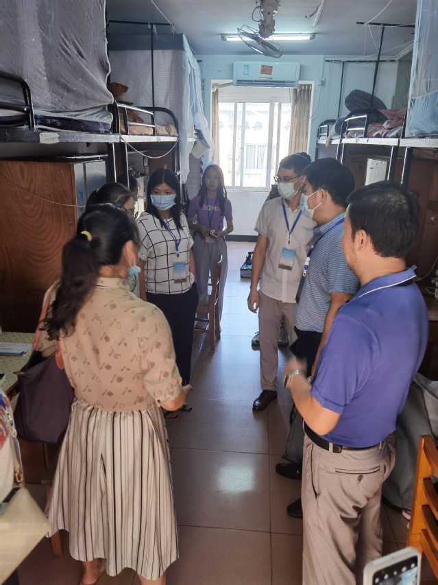 本网讯(通讯员 聂万欣)9月11日下午,为了解新生入住情况、提高新生防范诈骗意识,引导新生更好地适应大学生活,外国语学院(以下简称“外院”)分党委书记胡崇芝、院长刘晖、副书记吴少明、副院长胡波、院长助理唐植君以及全体辅导员在2021级新生寝室进行走访。