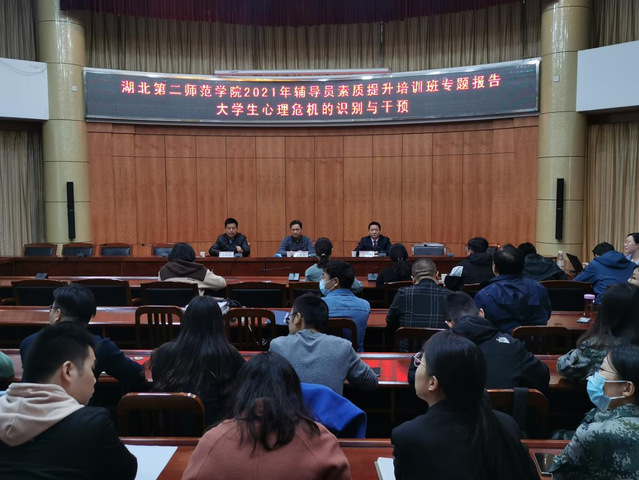 本网讯(通讯员 钱晓琳)10月22日下午,学校在行政楼一号会议室举行辅导员素质能力提升培训班专题讲座。会议邀请到湖北省青少年心理健康教育中心副主任、华中师范大学心理健康教育中心常务副主任吴才智教授作专题讲座。学工部副部长李小兵主持会议。