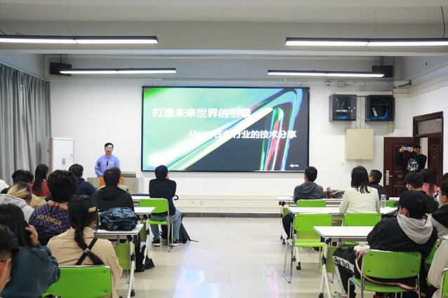 丁永军首先对Unity在工业、建筑行业的应用以及产品技术的能力展开介绍,之后以图表的形式向学生们呈现了Unity人才在各行业的分布比例和年收入区间,并介绍了现今Unity所施行的人才培养计划。宣讲会最后设置提问环节,解答了同学们的疑问。