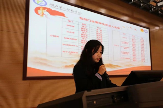 会议伊始,全体起立,奏唱《中华人民共和国国歌》。接着,徐梅馨老师宣读《关于管理学院第七届学生会秘书长和主席团的任职决定》和《关于管理学院团学组织主要学生负责人的任职决定》。