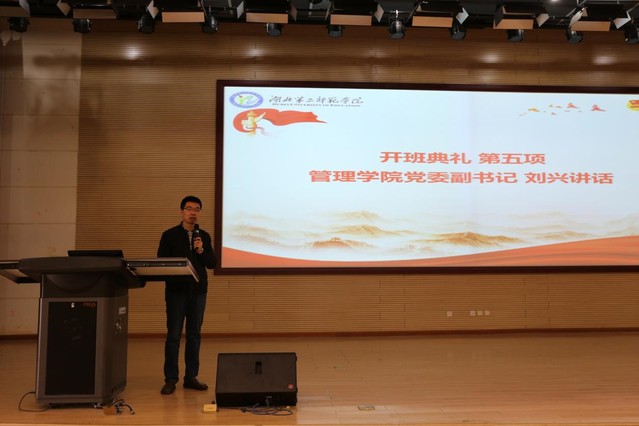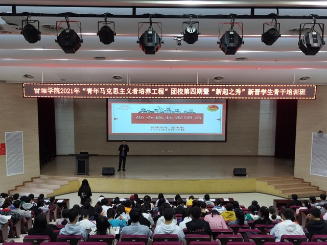 本网讯(通讯员 司子仪)为提高学生组织的思想政治素养和综合工作能力,保障人才梯队建设的严谨性、科学性、有效性、持续性,更好地服务学生和学校,10月26日中午,管理学院在图书馆二号报告厅举行2021年“青年马克思主义者培养工程”团校第四期暨“新起之秀”新晋学生骨干培训班开班仪式。管理学院党委副书记刘兴,学工办主任、分团委书记周慧东,分团委副书记席中刚、各班辅导员参加会议。本次会议由管理学院学生会执行主席詹琼姣主持。