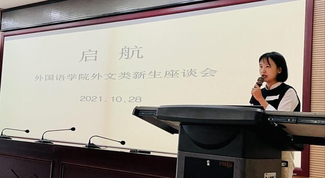 本网讯(通讯员 王尚彧)为了让2021级外国语言文学类新生更好更快地融入大学生活,规划大学学习目标,10月28日中午,外国语学院在新图书馆一号报告厅举行新生座谈会,外国语学院院长刘晖、副院长胡波,院系负责人、任课老师代表以及2021级外文类全体新生参加本次座谈会。本次会议由英语系主任陈曦主持。
