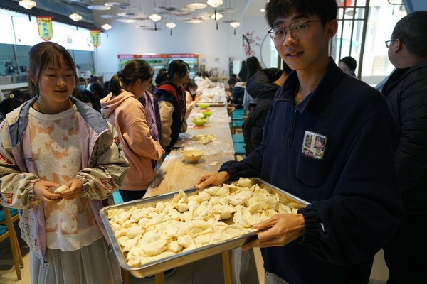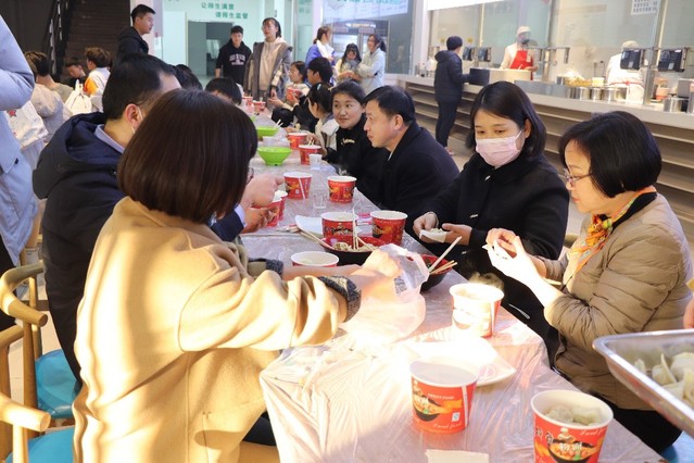 下午3点,老师们同学院100余名学生代表围坐一起,调馅料、擀饺皮、包饺子,现场忙碌不已又默契有序。