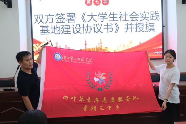 谈绍林与唐志强签订《大学生社会实践建设协议书》并为四叶草青年志愿服务队授旗。
