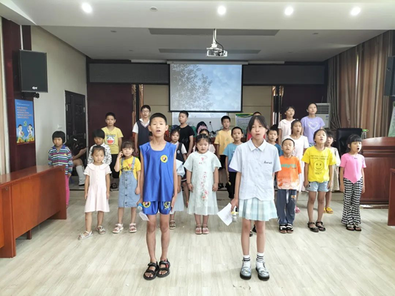 实践团队志愿者与孩子们共同汇报了演出了手势舞《青年志愿者之歌》。接着,汇报演出上同学们一起深情地朗诵《水调歌头》。