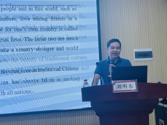 刘明东教授是湖南省教育督导评估专家、湖南省高校课程思政联盟副主任委员兼专家委员会委员。刘教授此次讲座的第一个主题是“‘以赛促教’推动外语课程思政高质量建设”,他指出,习近平总书记在北外校庆80周年之际给老教授的回信中,提出了培养“有家国情怀、有全球视野、有专业本领”的复合型人才的要求。所以课程思政的目的就是“立德树人、培根铸魂、启智增慧”,外语课程思政旨在培养“通语言、知国情、晓世界、爱中国”的复合型人才。他结合自身担任课程思政评委的经历,剖析了课程思政的授课方法以及课程思政竞赛的要点,分享了课程思政教学及比赛中的成功案例。
