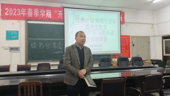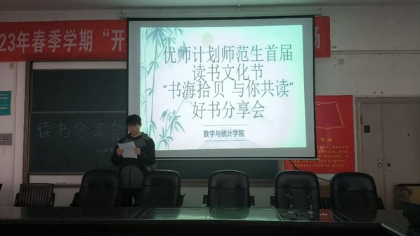 本网讯(通讯员 郑博涵)3月29日中午,数学与统计学院(以下简称“数统院”)在十号教学楼二楼会议室开展“优师计划”师范生首届读书文化节“书海拾贝,与你共读”读书分享会,数统院分党委书记林志红、副书记严国涛及学工办主任余江涛参加。
